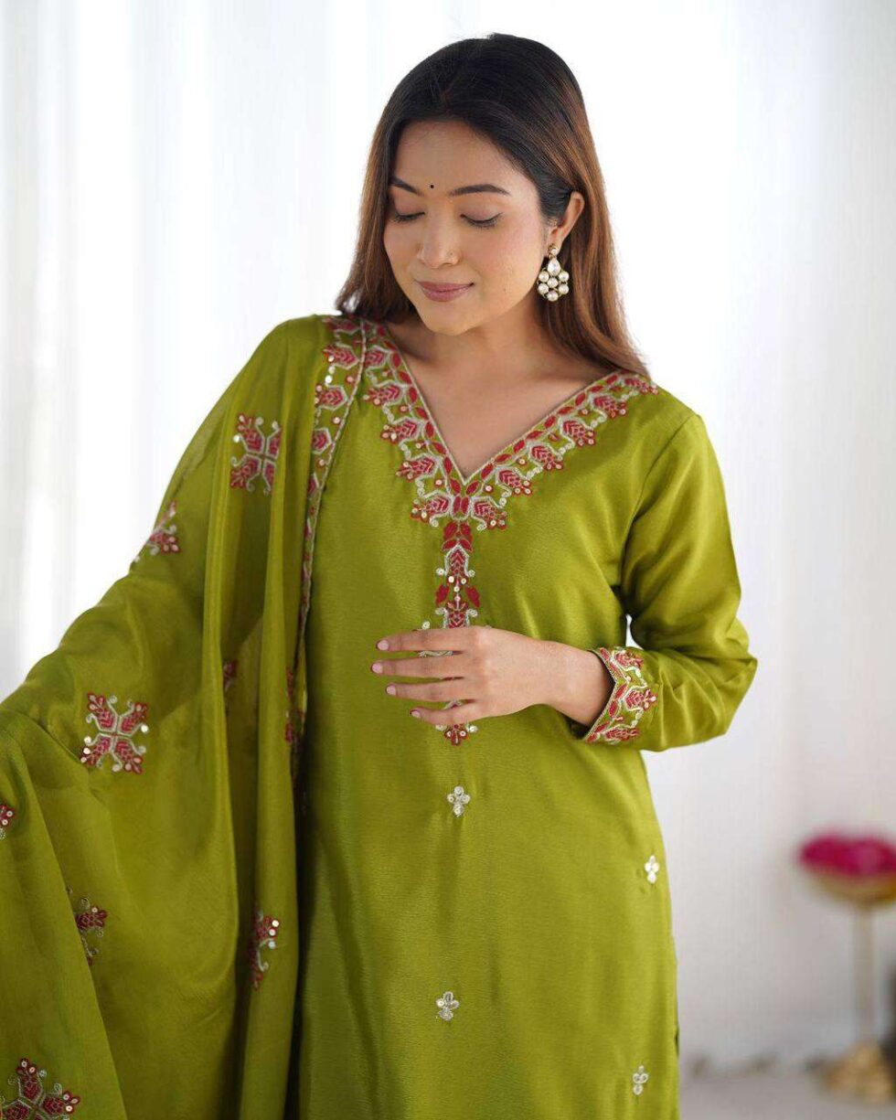 Women’s Chinnon Silk Embroidery Sequence Work and Lace Work Straight Kurti With Pant and Dupatta